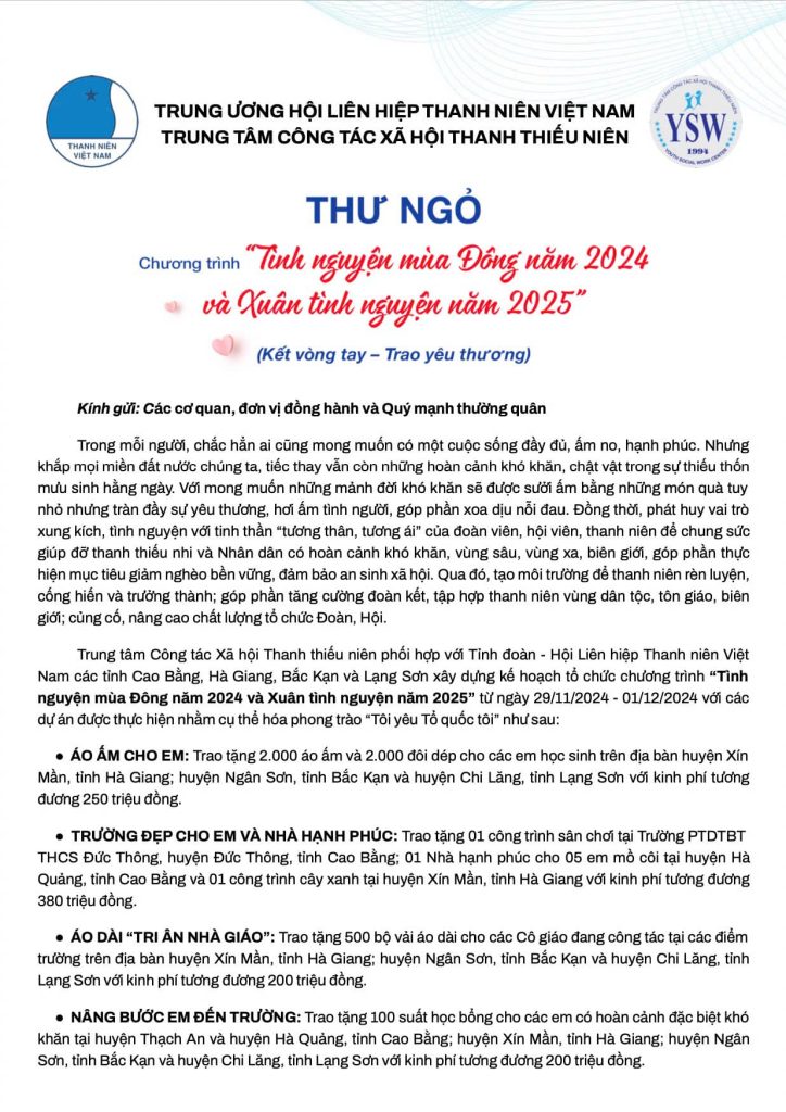 Kính gửi: Quý cơ quan, đơn vị đồng hành và các mạnh thường quân, Trong cuộc sống, vẫn còn nhiều hoàn cảnh khó khăn cần được sẻ chia, giúp đỡ. Với tinh thần “tương thân tương ái”, Trung tâm Công tác Xã hội Thanh thiếu niên phối hợp cùng Tỉnh Đoàn – Hội LHTN Việt […]