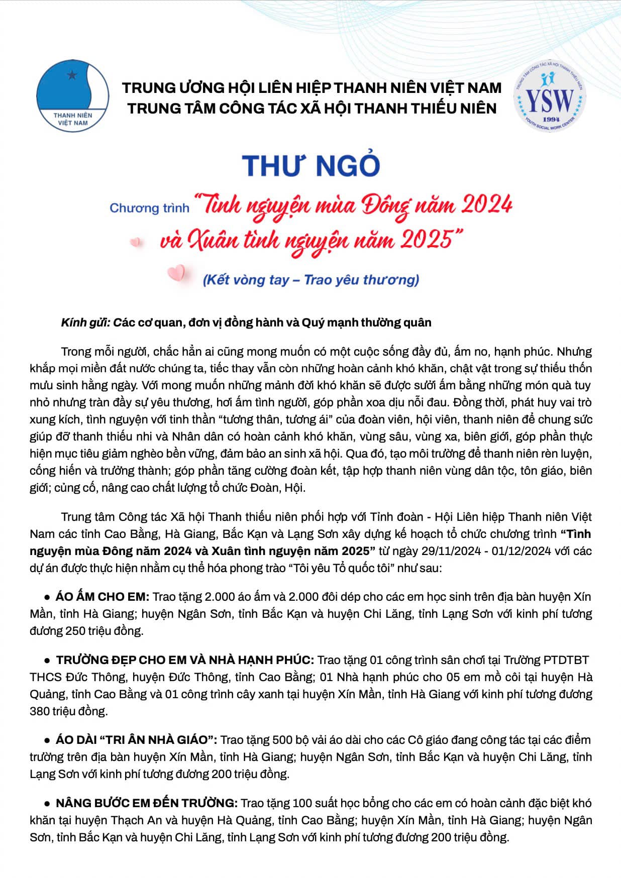 THƯ NGỎ CHƯƠNG TRÌNH ĐÔNG XUÂN TÌNH NGUYỆN